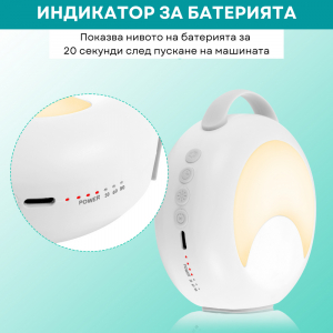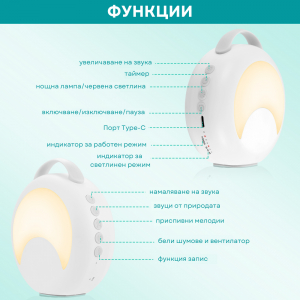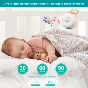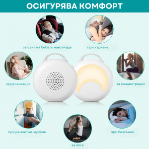 30 различни звука за всяко предпочитание: естествени звуци от природата (вълни, дъжд, сърцебиене, огън, птича песен и др.), бял, розов и кафяв шум, приспивни мелодии, звуци от техника